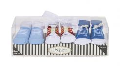Our socks are made from 100% knitted cotton and sized to fit 0-6 months. Each gift set contains 3 pairs of coordinating socks, beautifully packaged in a box with a ribbon bow and ready to give as a gift! Sock pairs are also sold separately.